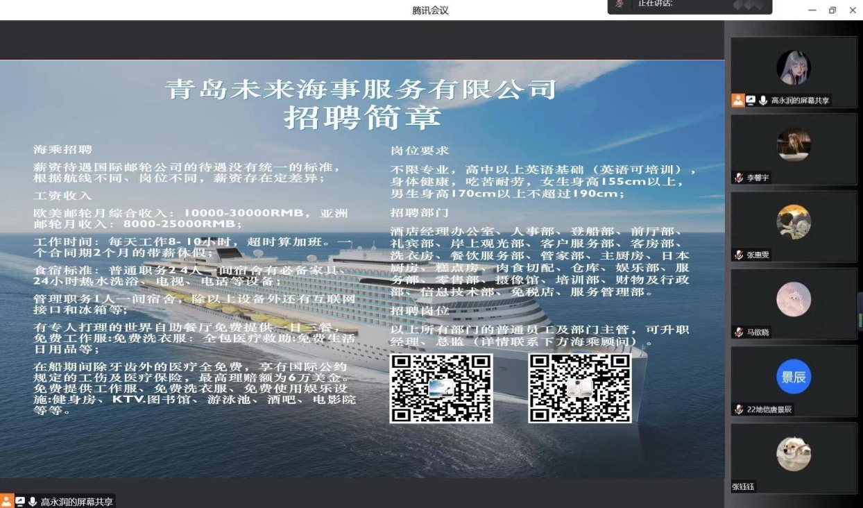 4月17日,bevictor韦德国际与青岛未来海事服务有限公司通过线上平台成功举办海事工作招聘宣讲会。此次宣讲会由青岛未来海事服务有限公司吕良主讲,20级国际旅游、酒店管理专业全体员工参与。