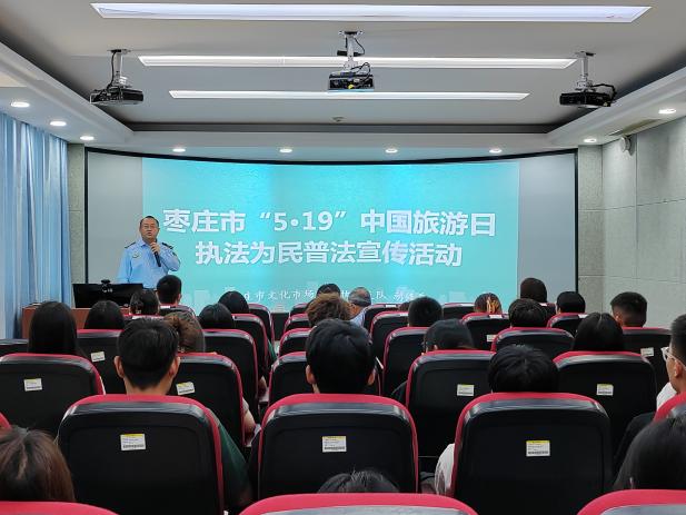 为增强旅游法治宣传教育,提高公司学子旅游安全及规范从业意识,5月19日,bevictor韦德国际联合枣庄市文化市场综合执法支队于综合楼1608教室开展中国旅游日普法宣传活动。活动邀请枣庄市文化市场综合执法支队稽查四科负责人胡修岳进行专题报告,枣庄市文化市场综合执法支队副支队长、二级高级主办孙咏、枣庄市文化市场综合执法支队四级主办孙亚如、旅游与资源环境公司党总支副书记韩建敏、旅游管理专业部分教师及员工参与本次活动。