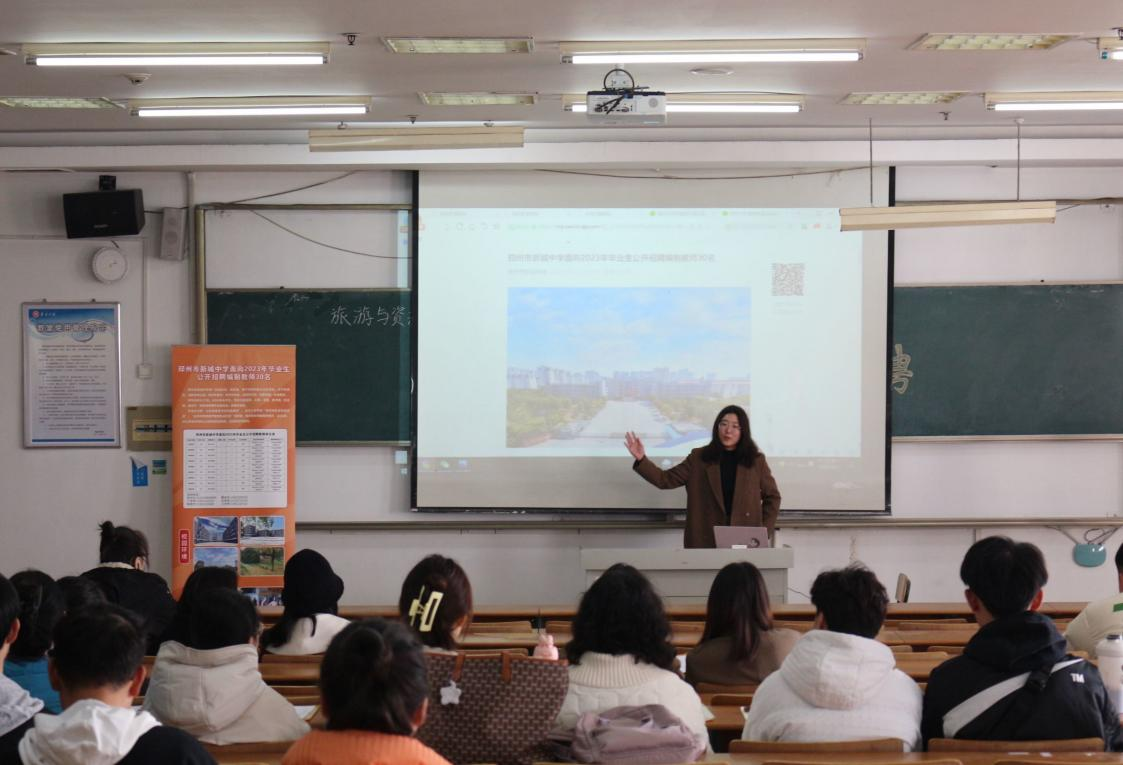 招聘会上,公司毕业生董欢结合自身经历,讲述在邳州新城中学的任职感受。同时,王建新通过PPT和视频向同学们介绍邳州新城中学的概况、校园设施、用人标准以及招聘政策等内容,询问同学们的求职意向、就业意愿以及就业过程中遇到的问题和困难;最后王建新耐心解答了同学们的疑问,鼓励同学们要自信向上、展现才能,积极参加各类招聘活动,树立正确的择业观以及就业观,把握宝贵的就业机遇,坚定就业信心、脚踏实地,顺利就业,不负韶华。
