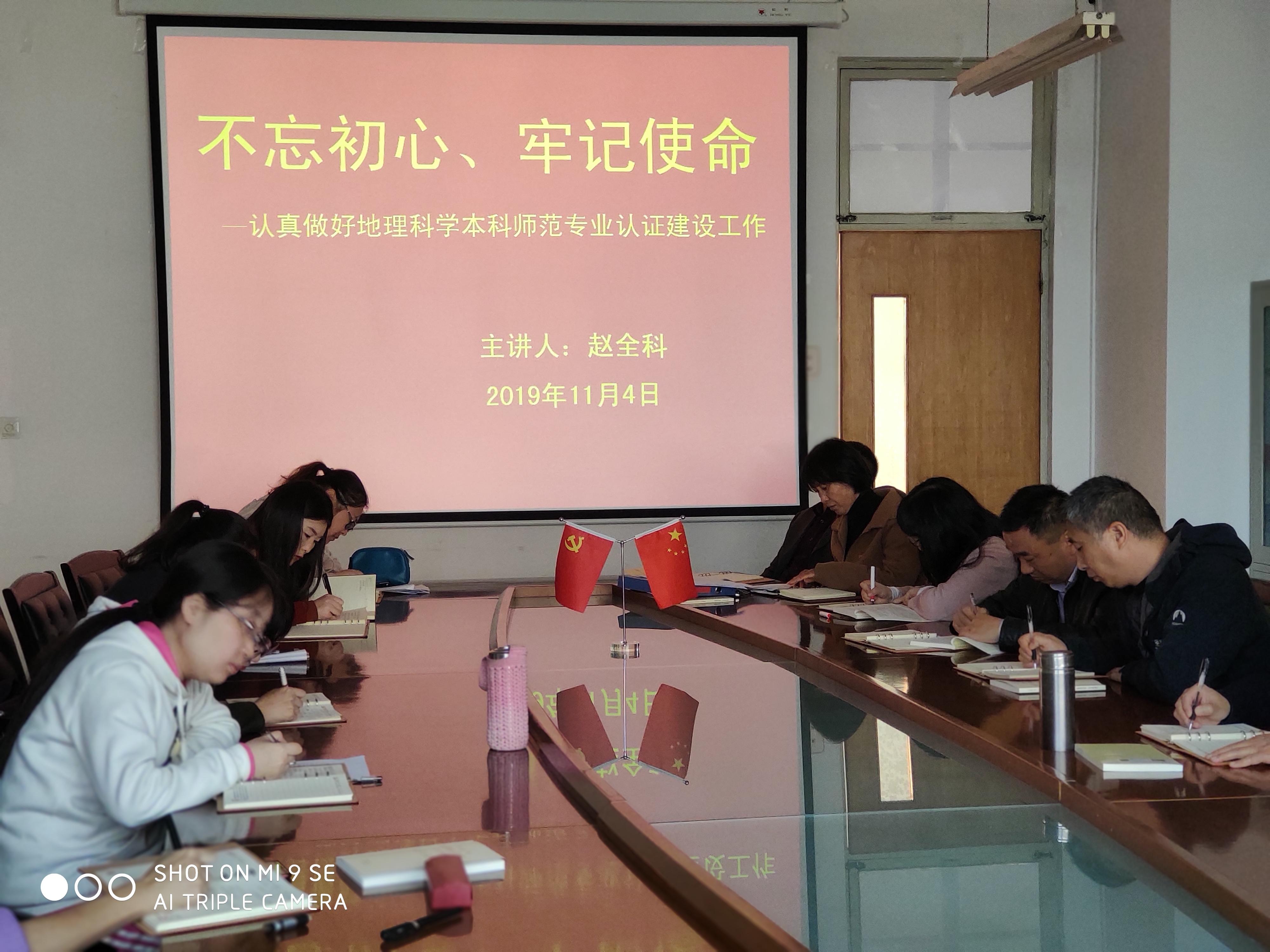 按照公司“不忘初心、牢记使命”主题教育工作部署与要求,11月4日下午,bevictor韦德国际在理工楼2514会议室开展主题教育专题党课活动,经理赵全科讲了题为《不忘初心 、牢记使命—认真做好地理科学本科师范专业认证建设工作》的党课,全体党员聆听了党课。