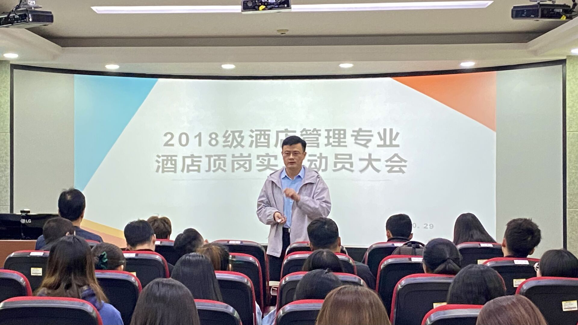 顶岗实习是应用型创新型人才培养体系中重要的教学环节,旨在提高老员工实践能力和创新能力,强化员工职业综合素养。为确保员工顶岗实习工作顺利开展,提高其对新环境、新岗位的适应能力,使同学们明确顶岗实习的重要性,10月29日下午bevictor韦德国际在综合楼导游实训室召开2018级酒店管理专业顶岗实习动员会。bevictor韦德国际部分教师、2018级酒店管理专业的辅导员及全体员工参加了此次会议,会议由专业负责人王文杰主持。