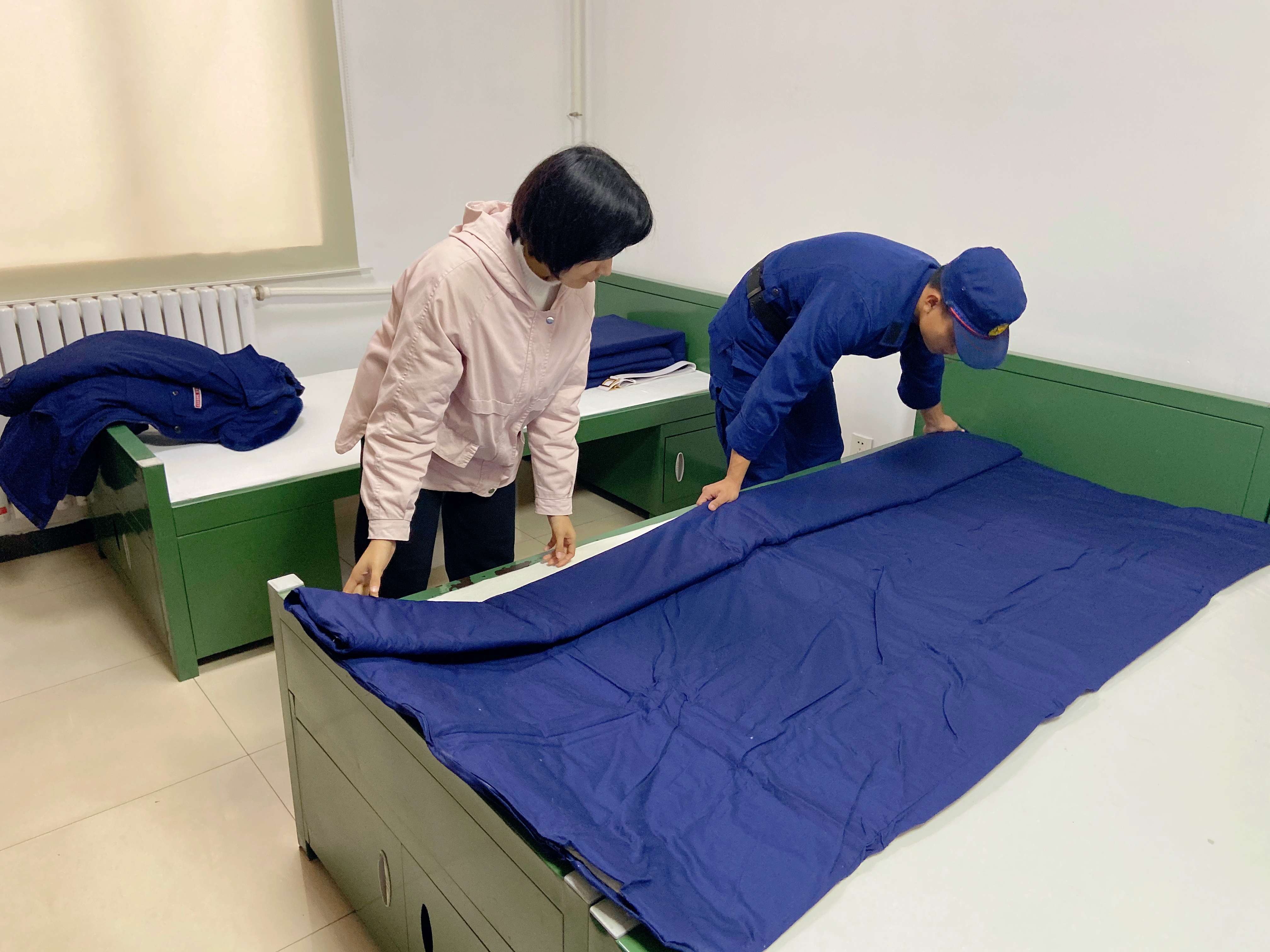 消防指战员秦队长向同学们讲解了灭火器、消防车辆性能参数、部分装备的基本用途。通过真实案例及火灾发生的起因、火场处置、逃生方法等知识,警醒大家要牢记火灾造成的惨痛教训,时刻树立火灾防范意识,最大限度避免火灾的发生。随后,消防队员向同学们展示了不同系列的消防服装,同学们身着消防防护服,操作消防器材,亲身体验消防员灭火作战的感受。最后,同学们参观了消防队员的寝室并现场实践学习叠军被。