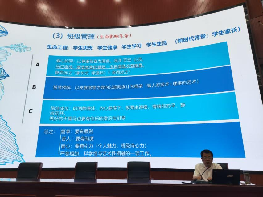 郝东蕴以“班主任:做育人教书的中国好老师”为题,与公司师生分享了自己的班主任经验。在报告中,郝东蕴主任首先分享了自己二十多年的班主任工作中的“苦”与“乐”,认为班主任是公司、科室、员工、家长的依靠。在班级管理方面,郝主任分享了“画方框”、“画圆饼”、“画叉号”、“画对号”的班级管理的技与艺,认为这是一项严慈相加,科学性与艺术性相融的一项工作,需做到管事要有原则、管人要有制度、管心要有引力。最后,提出了新时代下班主任专业成长的几点新需求:加强学习、不断突破、加强情趣、善于生活。