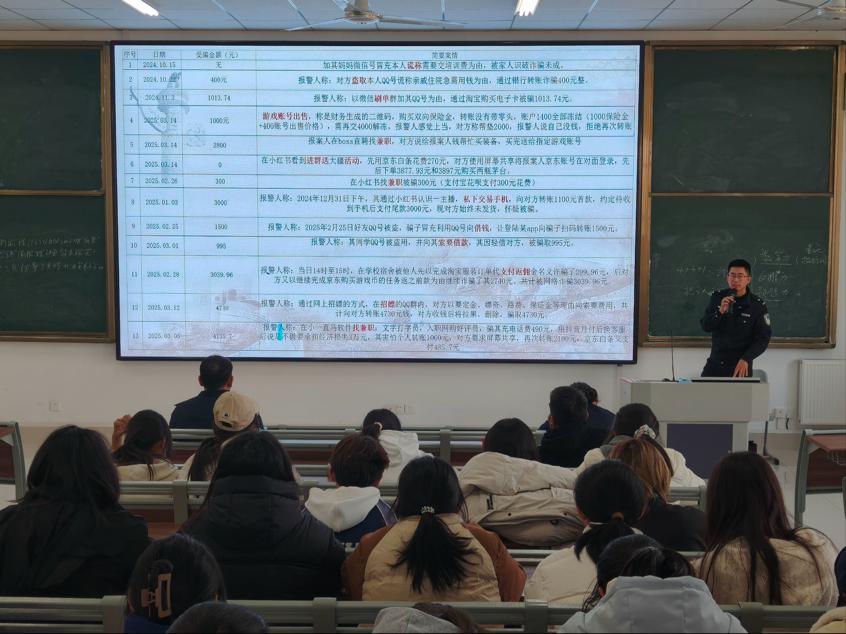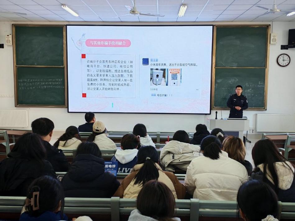 为深入推进党建引领校园安全工作走深走实,提高风险防范处置能力,11月19日,旅游与资源公司在崇德楼4208教室开展防诈骗主题讲座。本次活动特邀薛城公安分局沙沟派出所民警刘浩元主讲,部分2025级员工和师生参加。