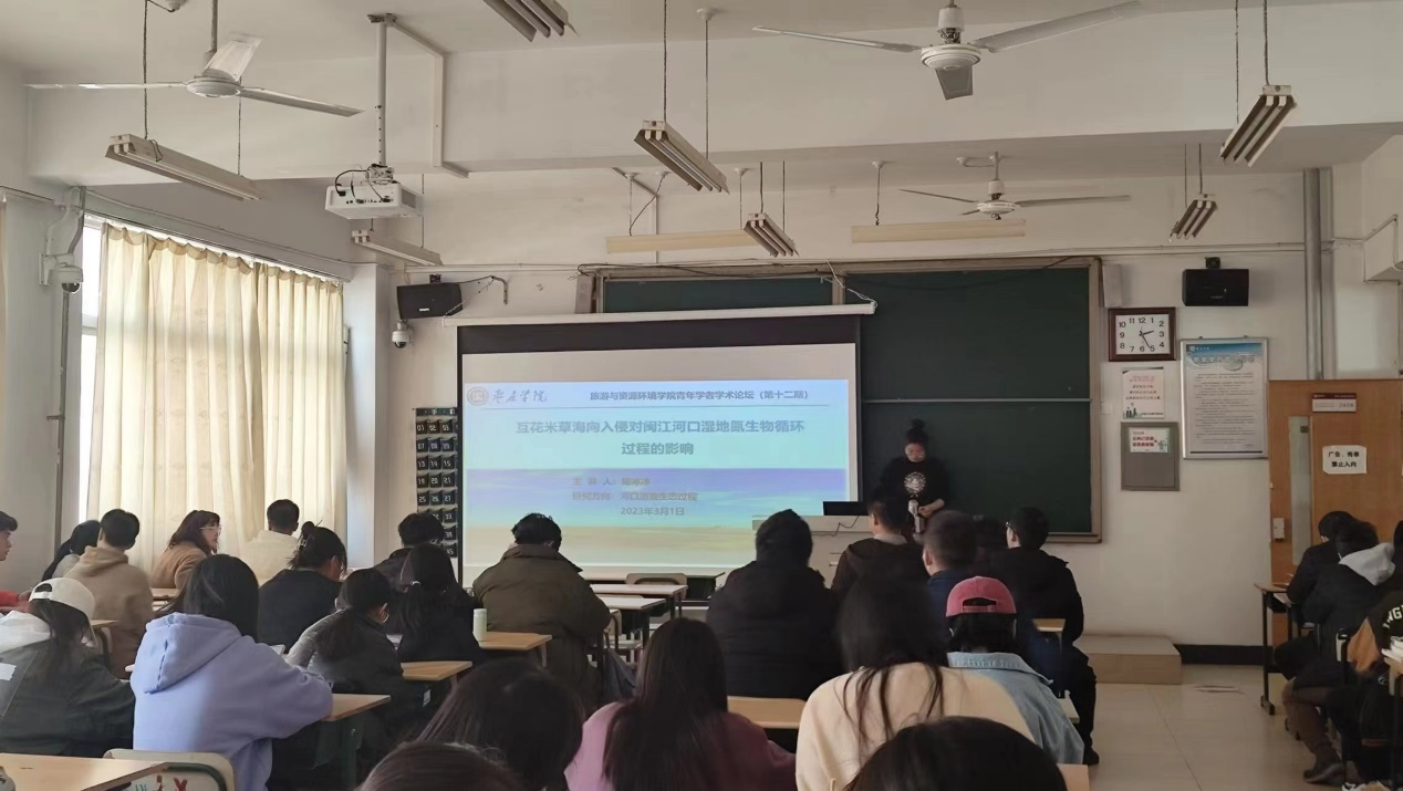 报告会上,陈冰冰博士做了题为“互花米草海向入侵对闽江河口湿地氮生物循环过程的影响”的学术报告,介绍了互花米草自身特性(极强的促淤能力)对潮滩湿地环境的改变以及对生源元素循环过程的影响,尤其是对氮生物循环的影响。以闽江河口鳝鱼滩湿地互花米草入侵前的光滩、入侵1年互花米草湿地和入侵7年互花米草湿地为研究对象,通过野外定位采样、野外原位培养试验和野外模拟淤积强度分解试验,探讨了互花米草海向入侵影响下湿地植物-土壤系统氮时空分布、转运、转化及主要功能微生物群落特征,揭示了互花米草海向入侵对湿地氮生物循环的关键影响机制,明晰了互花米草海向入侵与湿地氮生物循环之间的动因关系。研究结果不仅为深入了解互花米草入侵影响下河口湿地氮生物循环过程提供理论依据,还从维持潮滩湿地氮库稳定性角度,为下一步海向入侵的互花米草治理提供了新思路。