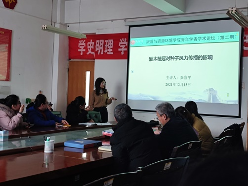 秦宣平博士以“灌木植冠对种子风力传播的影响”为题,从种子风力传播的过程和意义引入,结合大量野外调查和室内试验数据,详细阐述了植冠对传播过程的影响、传播体属性和植冠特性以及风速相互作用对种子风力传播分布格局的影响,展示了系列科学研究成果。