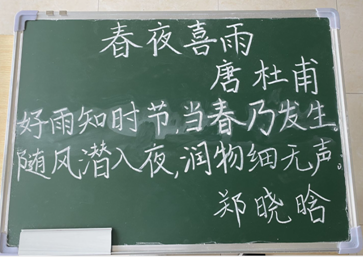 比赛开始后,选手们便聚精会神的投入到粉笔字书写之中。每位参赛选手都认真对待、一笔一画、一丝不苟,一行行整齐的粉笔字跃然于黑板上。作品经老师评定后,20地理科学本科一班的郑晓晗同学获得本次比赛的一等奖。