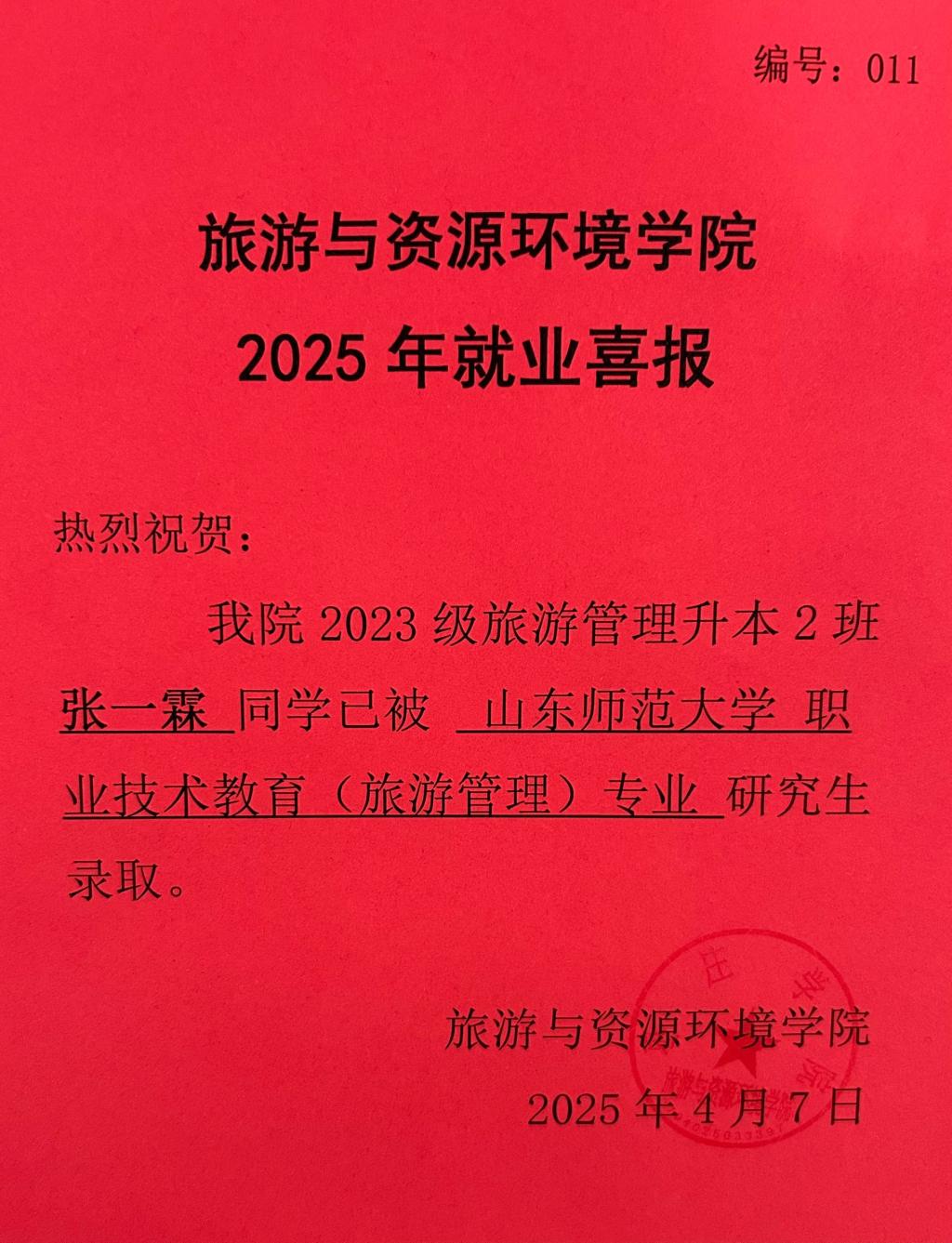 喜报!23旅游管理升本2班张一霖被山东师范大学录取!