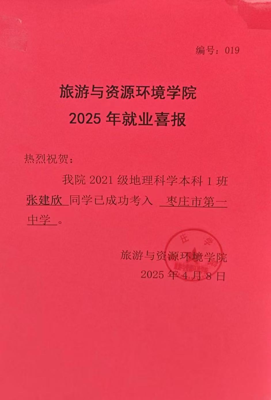 喜报!21地理科学本科1班张建欣成功考入枣庄市第一中学!