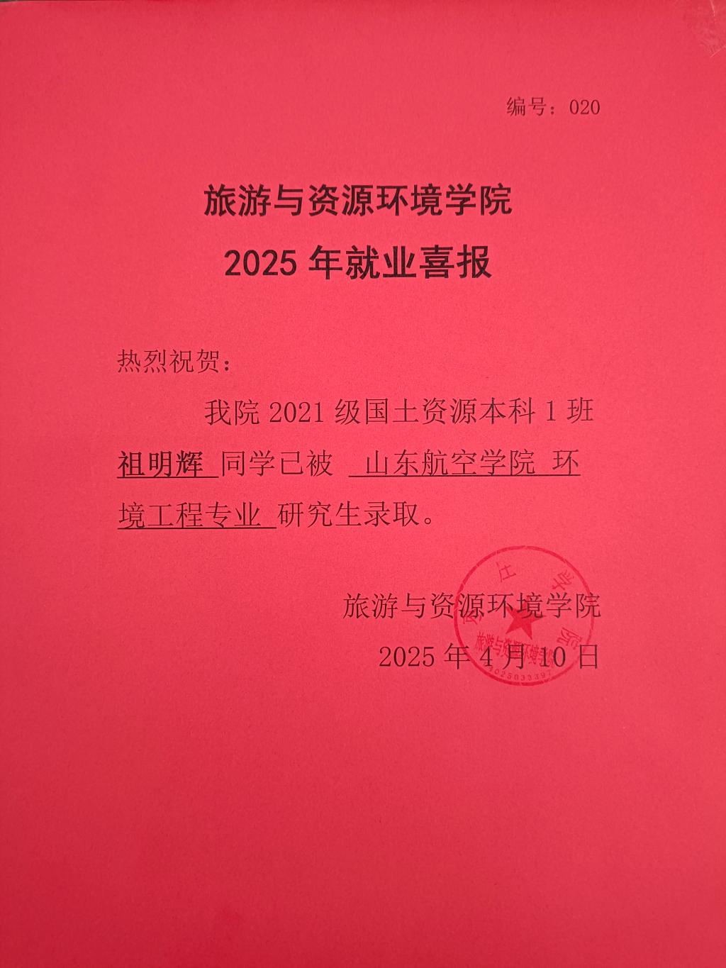 喜报!21国土资源本科1班祖明辉被山东航空公司录取!