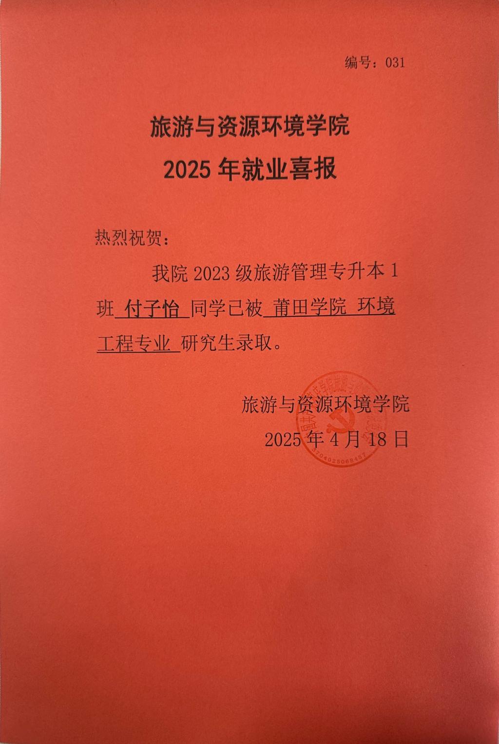 喜报!23旅游管理升本1班付子怡被莆田公司录取!