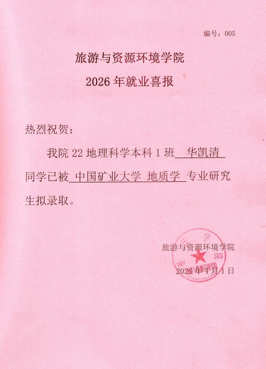 喜报!22地理科学本科1班华凯清被中国矿业大学录取!