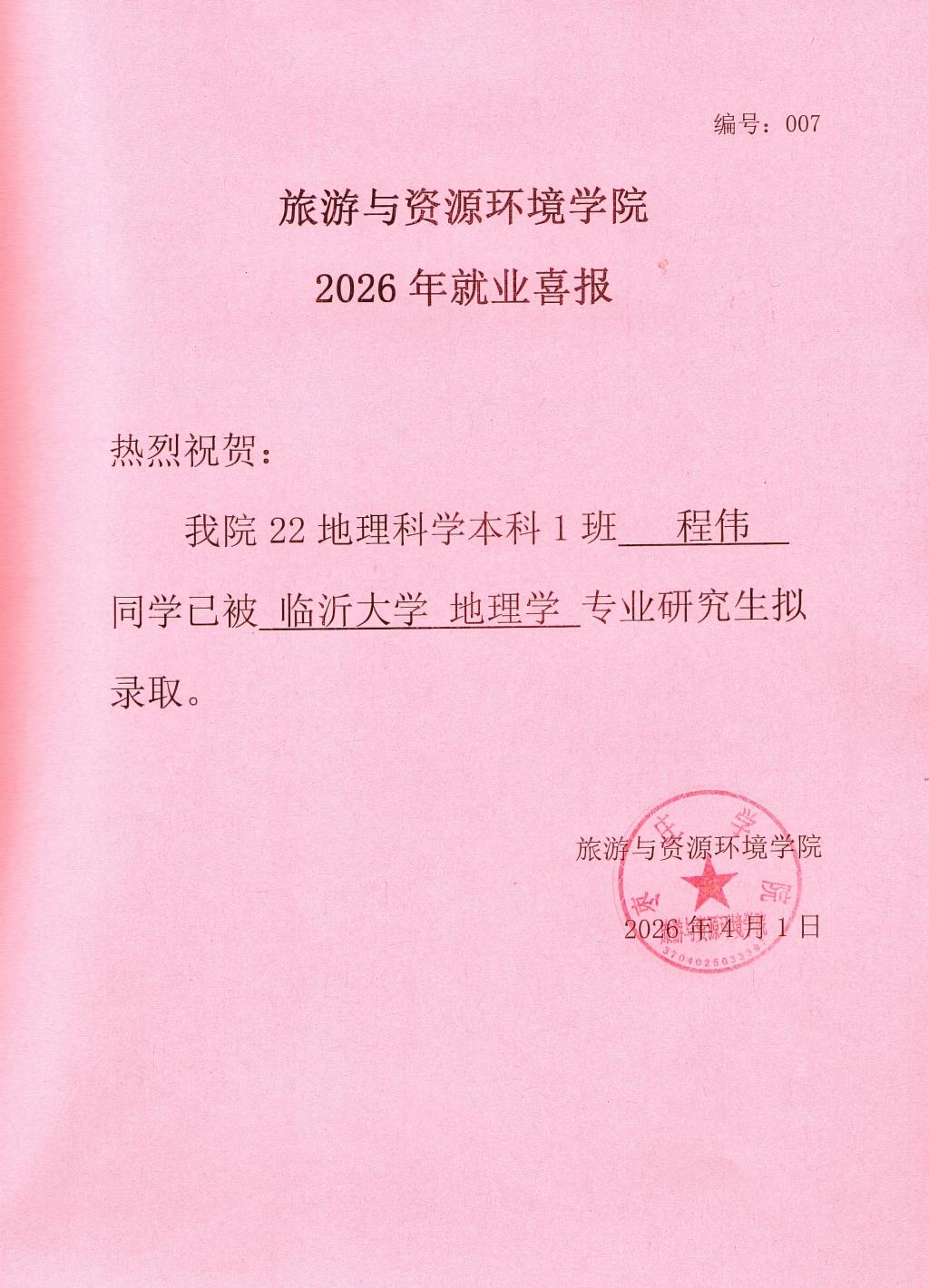 喜报!22地理科学本科1班程伟被临沂大学录取!