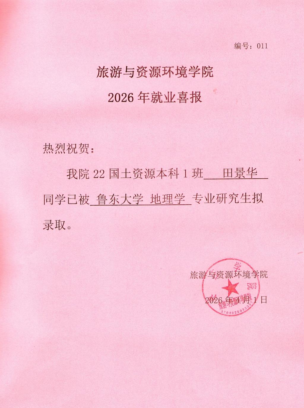 喜报!22国土资源本科1班田景华被鲁东大学录取!