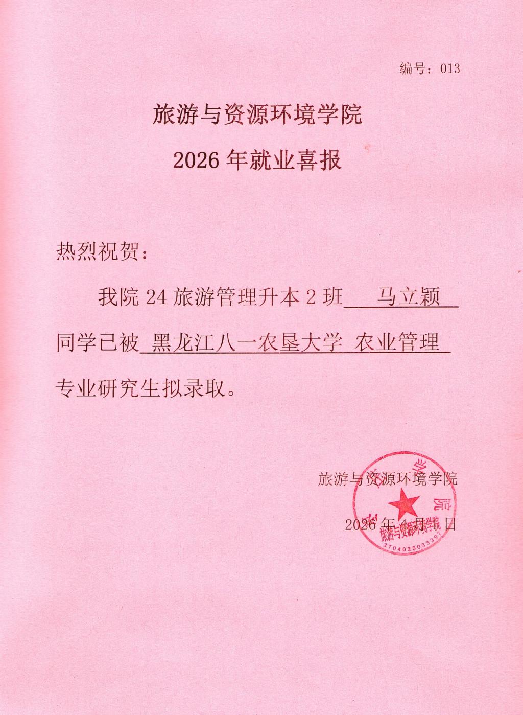 喜报!24旅游管理升本2班马立颖被黑龙江八一农垦大学录取!