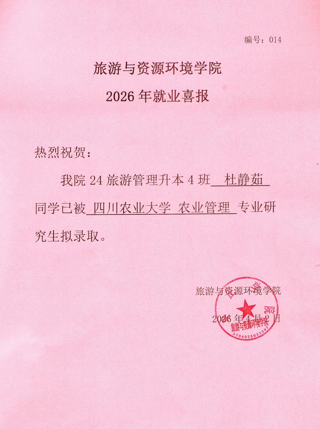 喜报!24旅游管理升本4班杜静茹被四川农业大学录取!