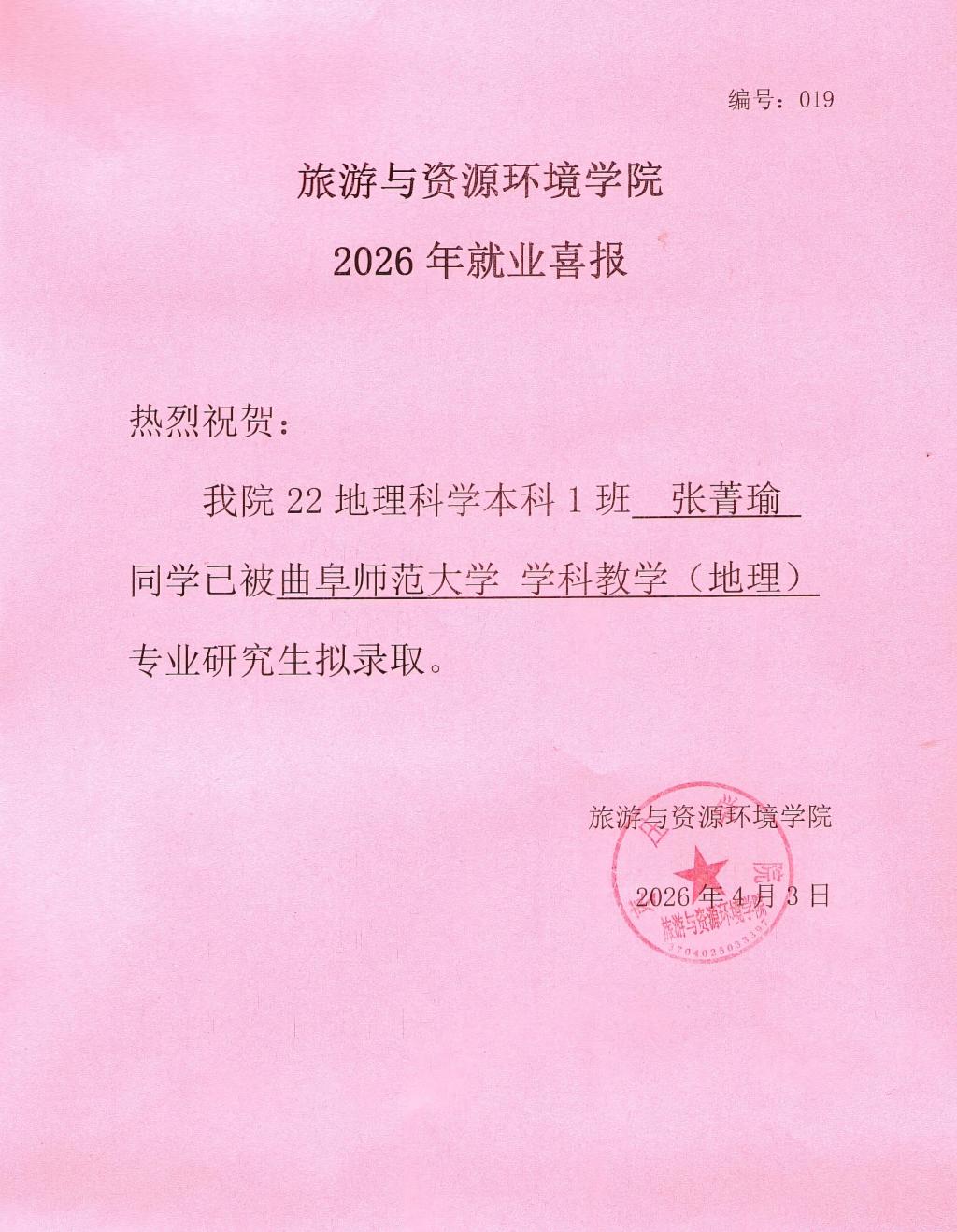 喜报!22地理科学本科1班张菁瑜被曲阜师范大学录取!
