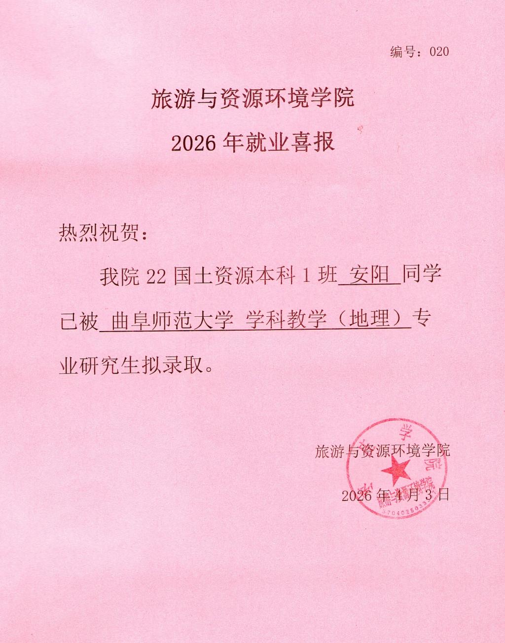 喜报!22国土资源本科1班安阳被曲阜师范大学录取!