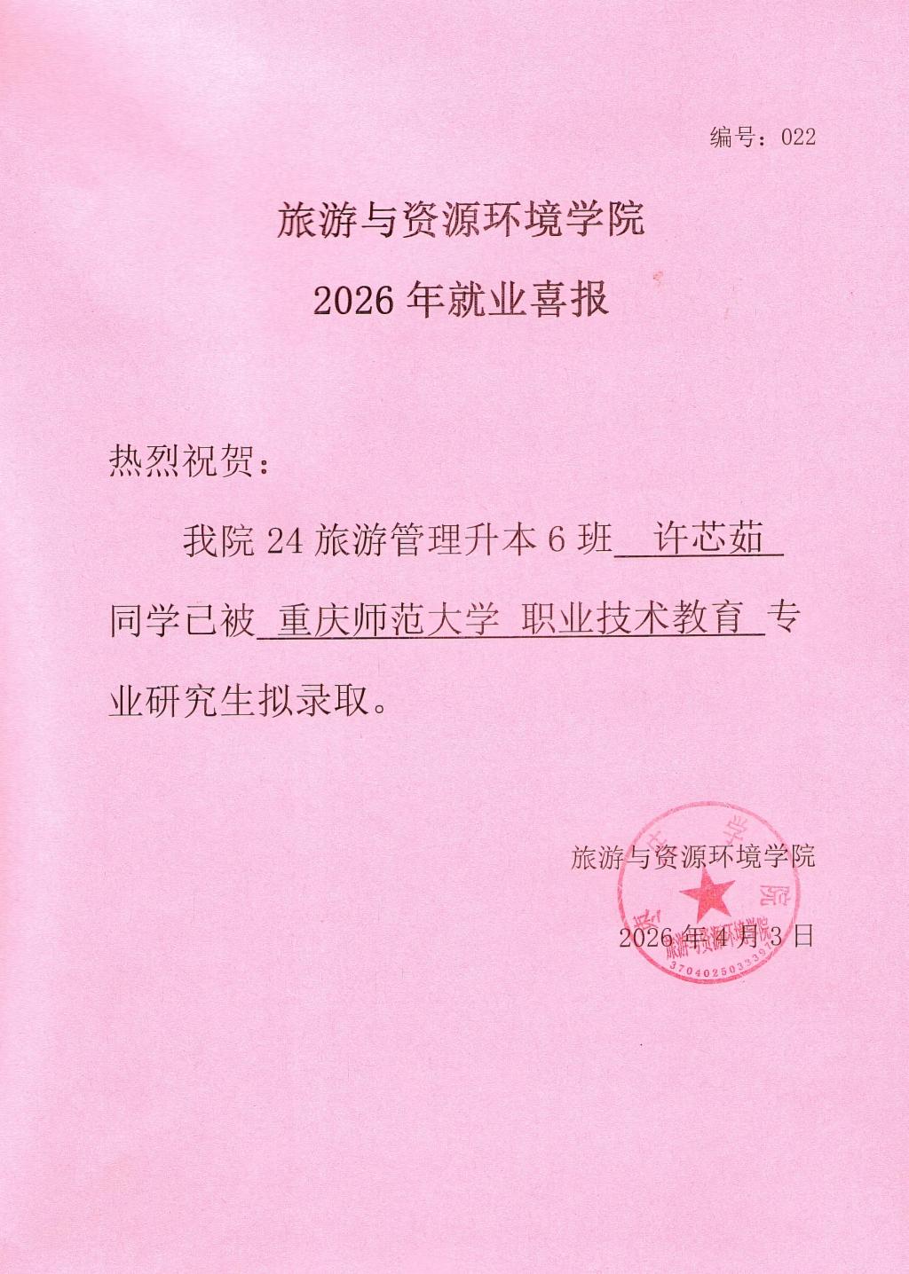 喜报!24旅游管理升本6班许芯茹被重庆师范大学录取!